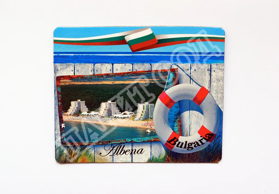 Сувенирен магнит със снимка от Албена и надпис Албена, България. Предлага се опакован в щендерен целофан.