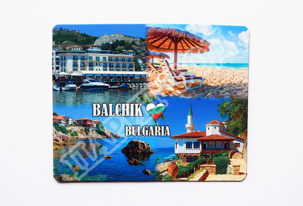 Сувенирен магнит със снимки от Балчик и надпис Балчик, България. Предлага се опакован в щендерен целофан.