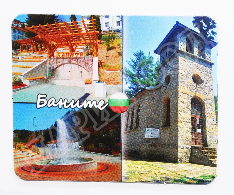 Сувенирен магнит със снимки от с. Баните. Предлага се опакован в щендерен целофан.