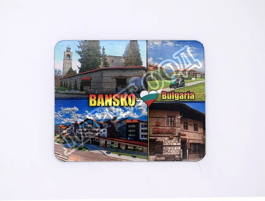 Сувенирен магнит със снимки от Банско и надпис Банско. Предлага се опакован в щендерен целофан.