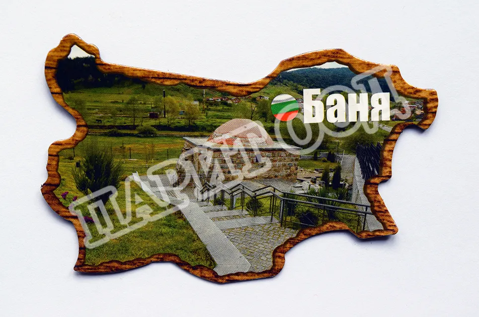 Сувенирен магнит със снимка от с. Баня, Разлог. Предлага се опакован в щендерен целофан.