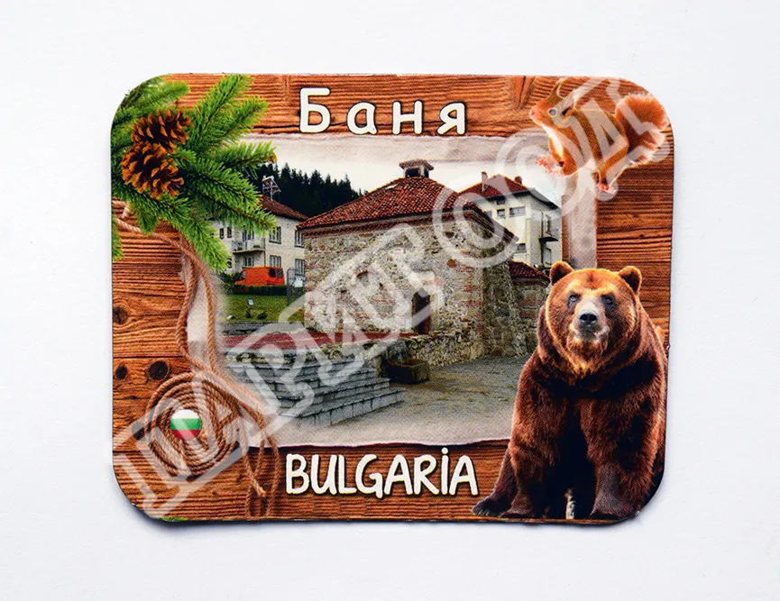 Сувенирен магнит със снимки от с. Баня, Разлог. Предлага се опакован в щендерен целофан.