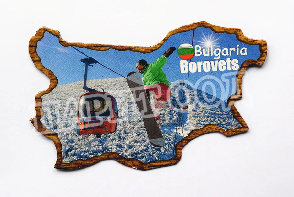 Сувенирен магнит със снимка от Боровец и надпис Боровец, България. Предлага се опакован в щендерен целофан.