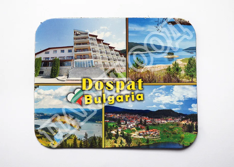 Сувенирен магнит със снимки от Доспат и надпис Доспат, България. Предлага се опакован в щендерен целофан.