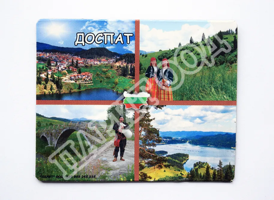 Сувенирен магнит със снимки от Доспат. Предлага се опакован в щендерен целофан.