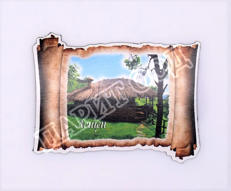 Сувенирен магнит със снимка от Лещен. Предлага се опакован в щендерен целофан.