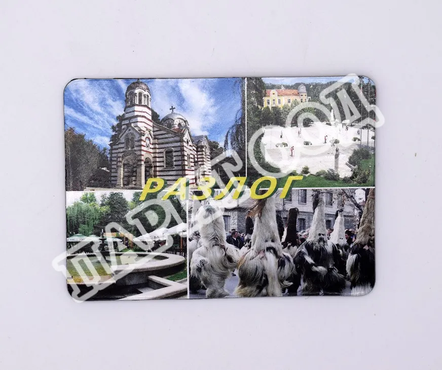 Сувенирен магнит със снимки от Разлог. Предлага се опакован в щендерен целофан.