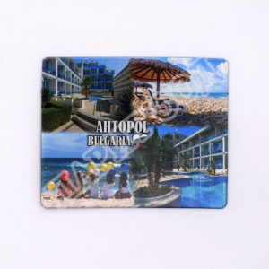 Ръчно изработен релефен магнит във формата на мидена черупка, инкрустиран със стилни мъниста, истински мидени черупки, декоративни фигурки и тематична снимка, запечатани с прозрачна епоксидна смола.