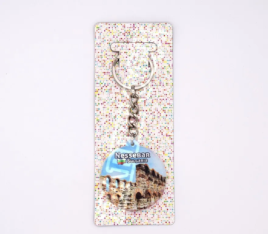 Метален ключодържател-отварачка със снимка от Несебър. Предлага се опакован в щендерен целофан.