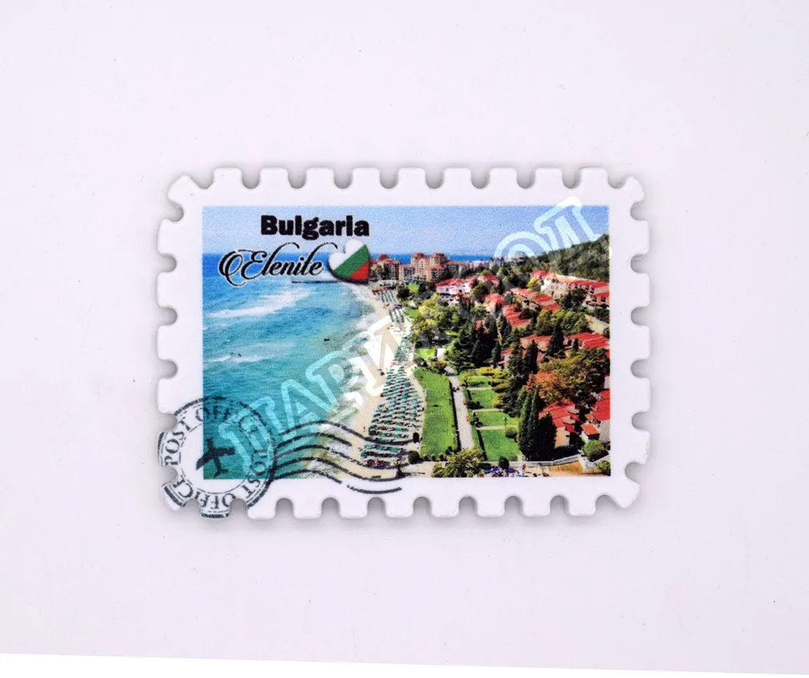 Сувенирна магнитна фигурка във форма на пощенска марка и със снимка от ваканционно селище Елените. Предлага се опакована в щендерен целофан.