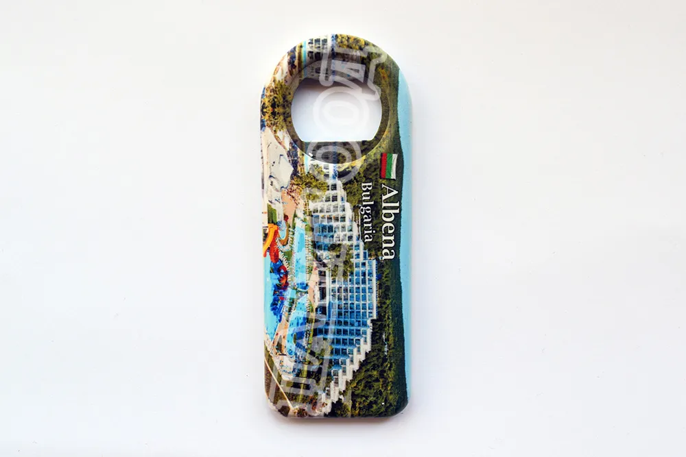 Сувенирна магнитна отварачка със снимка от Албена и надпис Албена, България. Предлага се опакована в щендерен целофан.