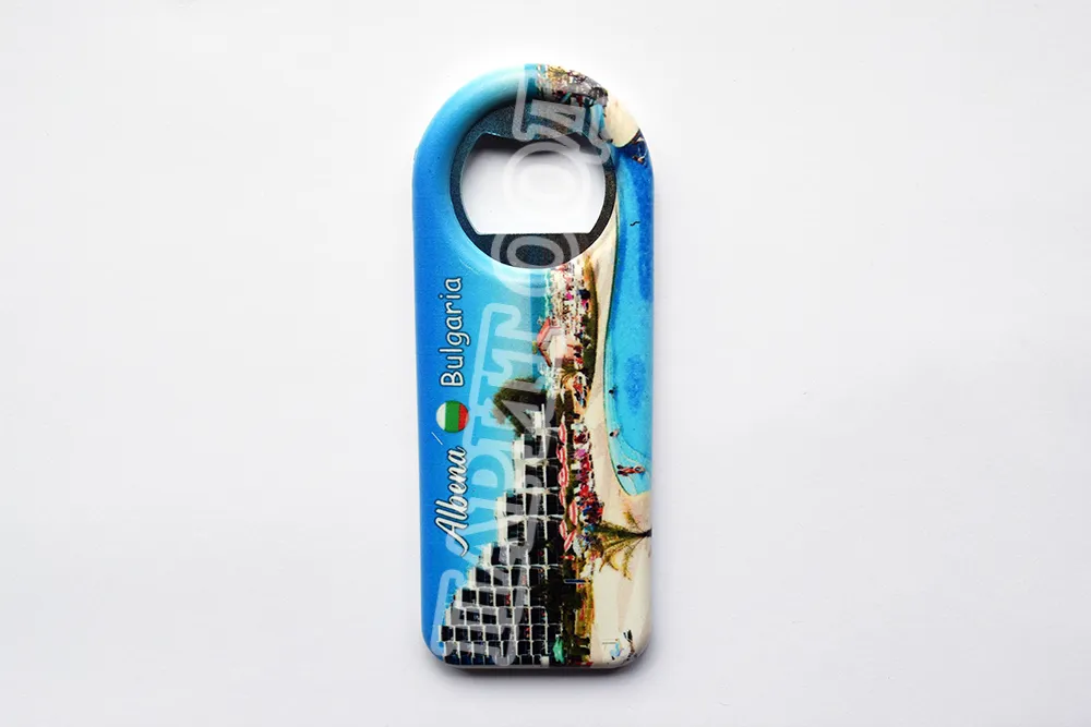 Сувенирна магнитна отварачка със снимка от Албена и надпис Албена, България. Предлага се опакована в щендерен целофан.