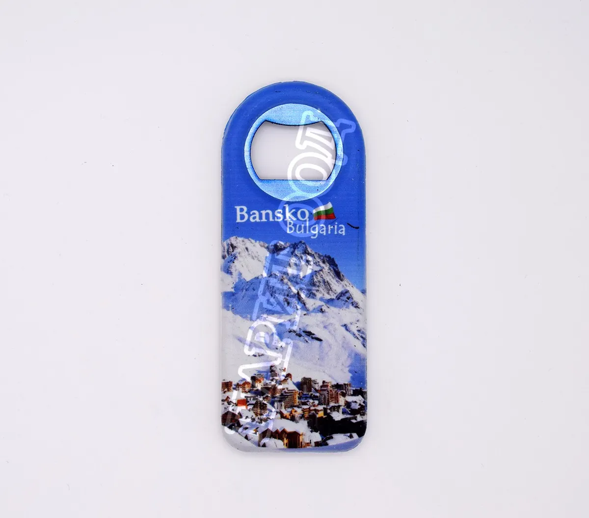 Сувенирна магнитна отварачка със снимка от Банско. Предлага се опакована в щендерен целофан.