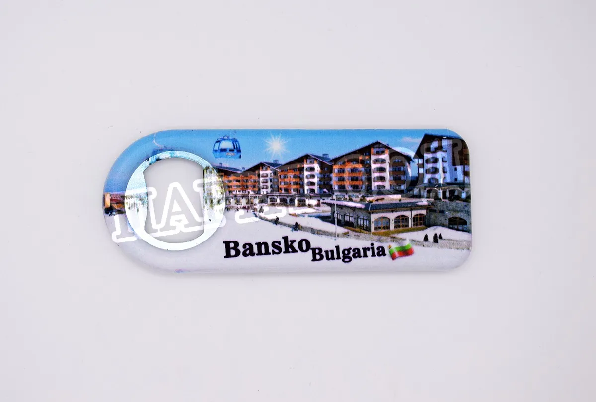 Сувенирна магнитна отварачка със снимка от Банско. Предлага се опакована в щендерен целофан.