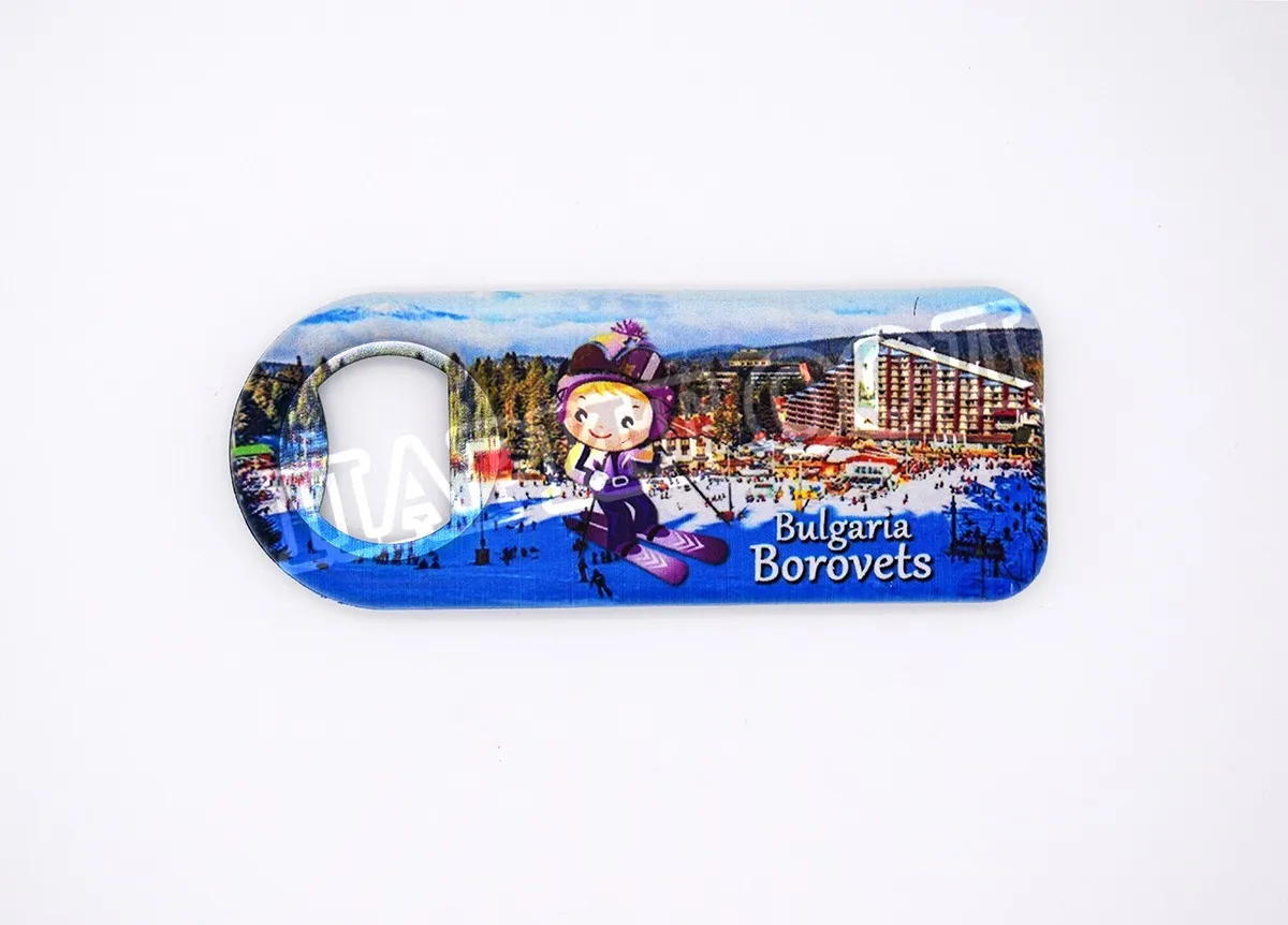 Сувенирна магнитна отварачка със снимка от Боровец. Предлага се опакована в щендерен целофан.