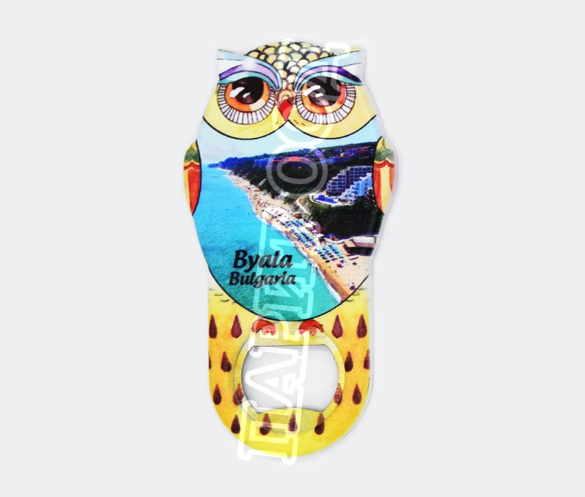 Сувенирна магнитна отварачка ”сова” със снимка от Бяла. Предлага се опакована в щендерен целофан.