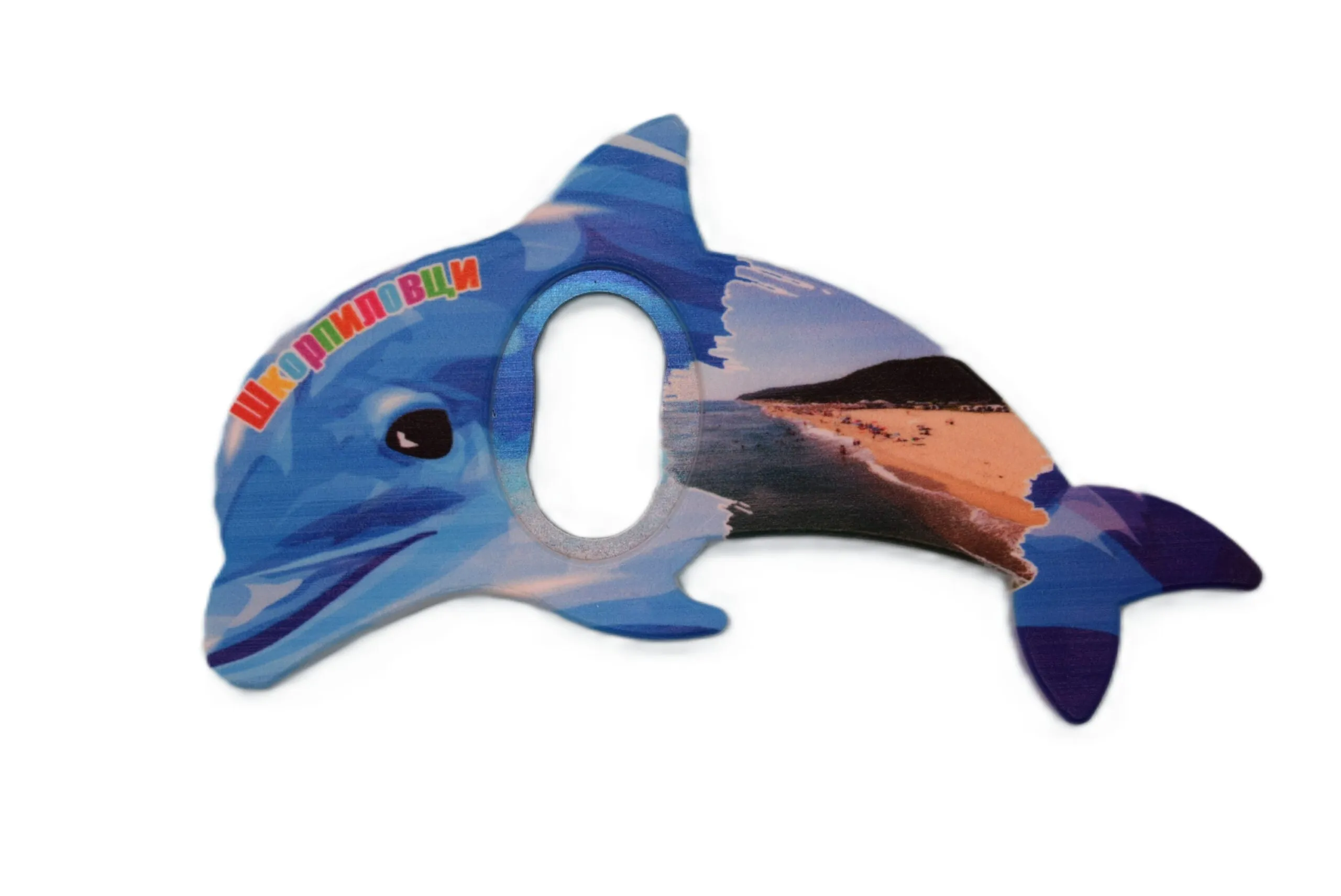Сувенирна магнитна отварачка тип делфин с тематична снимка.