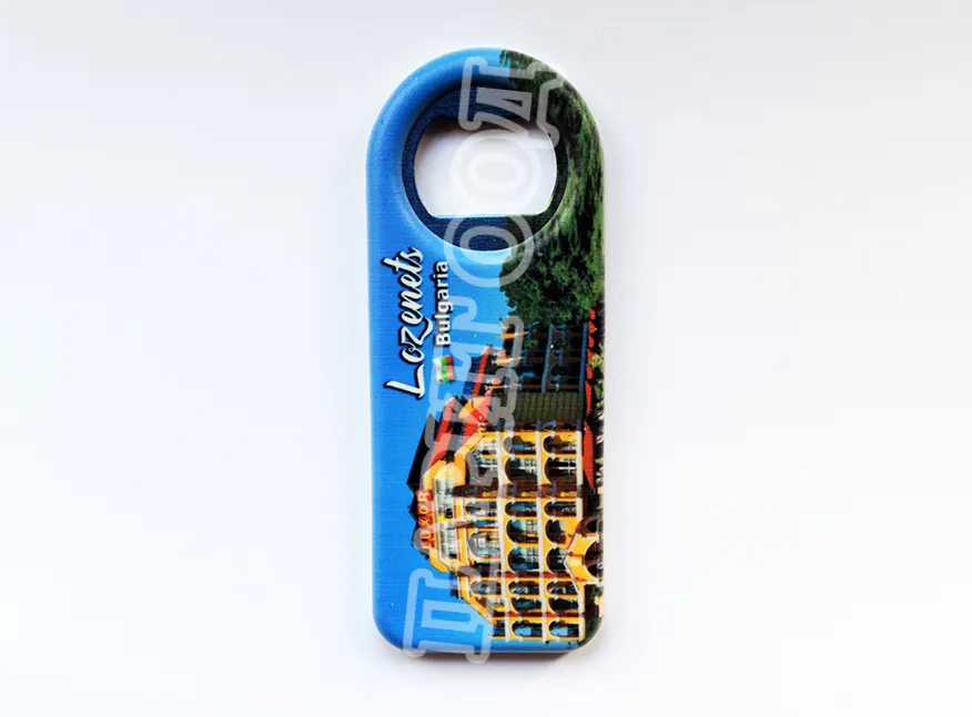 Сувенирна магнитна отварачка със снимка от ваканционно селище Лозенец и надпис Лозенец, България. Предлага се опакована в щендерен целофан.