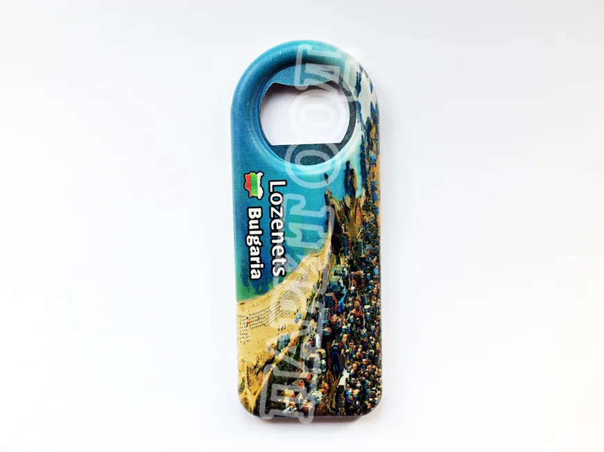Сувенирна магнитна отварачка със снимка от ваканционно селище Лозенец и надпис Лозенец, България. Предлага се опакована в щендерен целофан.
