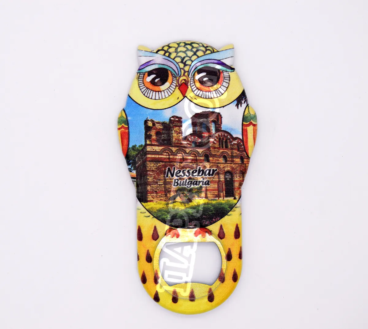 Сувенирна магнитна отварачка “сова“ със снимка от Несебър. Предлага се опакована в щендерен целофан.