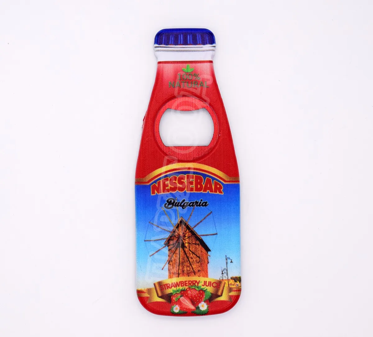 Сувенирна магнитна отварачка “шише“ със снимка от Несебър. Предлага се опакована в щендерен целофан.
