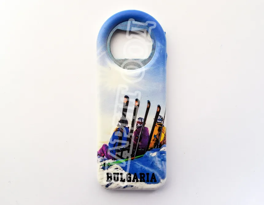 Сувенирна магнитна отварачка със снимка от Пампорово и надпис България. Предлага се опакована в щендерен целофан.