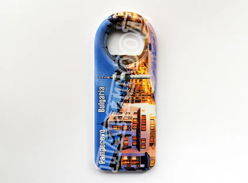 Сувенирна магнитна отварачка със снимка от Пампорово и надпис Пампорово, България. Предлага се опакована в щендерен целофан.