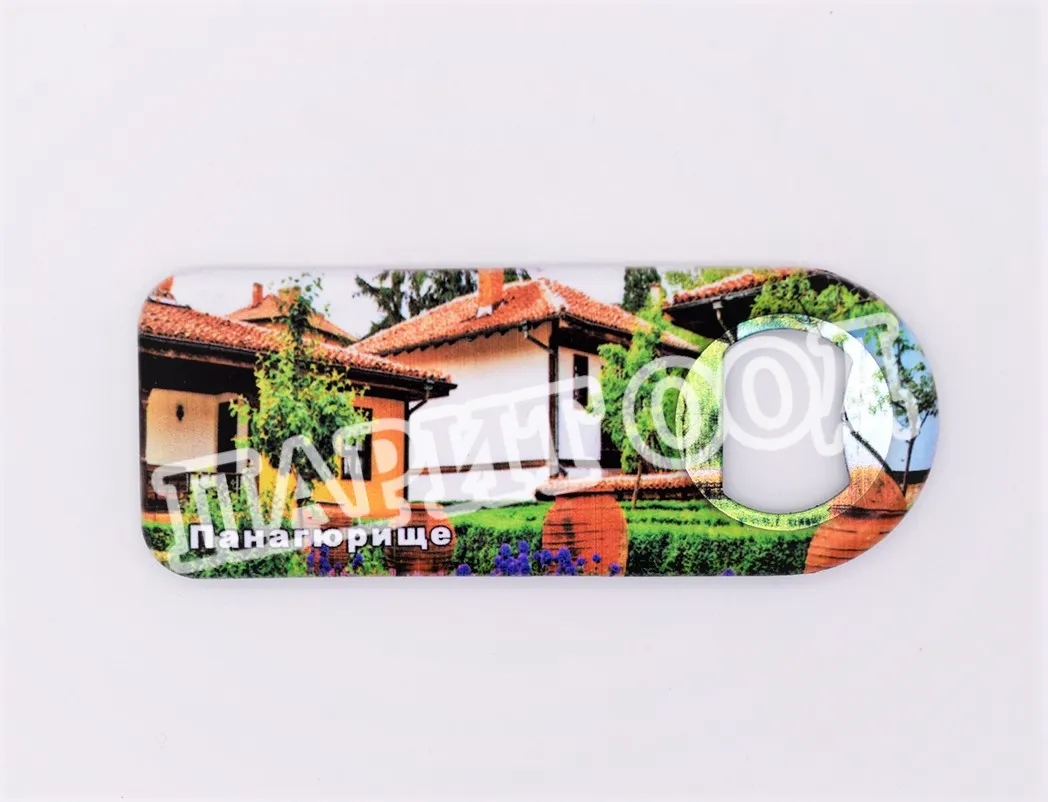 Сувенирна магнитна отварачка със снимка от Панагюрище. Предлага се опакована в щендерен целофан.