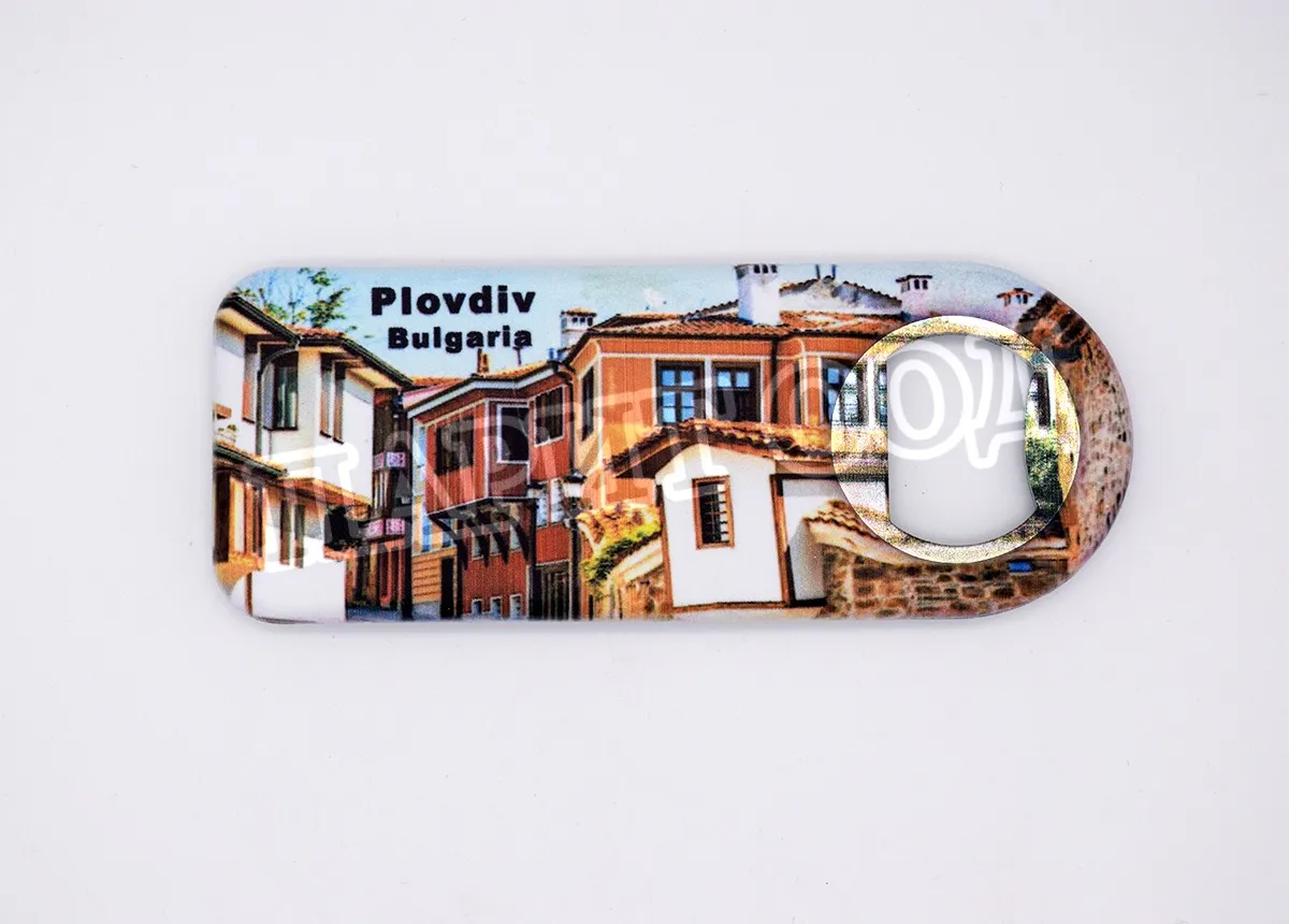 Сувенирна магнитна отварачка със снимка от Пловдив. Предлага се опакована в щендерен целофан.