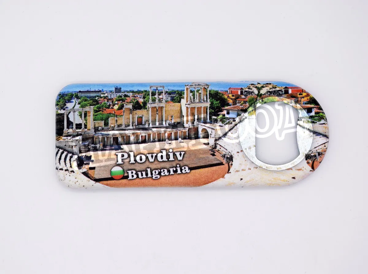 Сувенирна магнитна отварачка със снимка от Пловдив. Предлага се опакована в щендерен целофан.