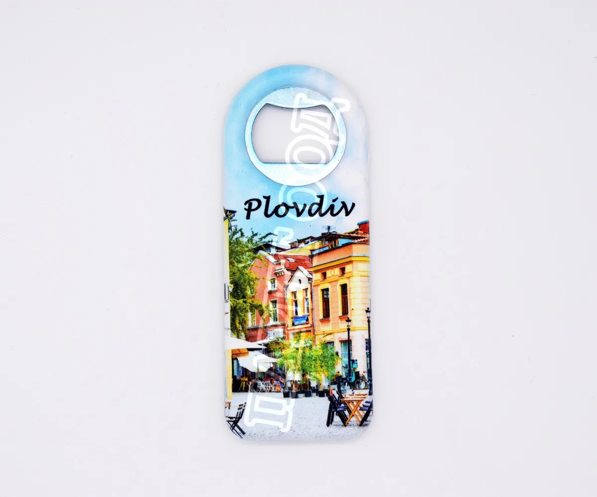 Сувенирна магнитна отварачка със снимка от Пловдив. Предлага се опакована в щендерен целофан.