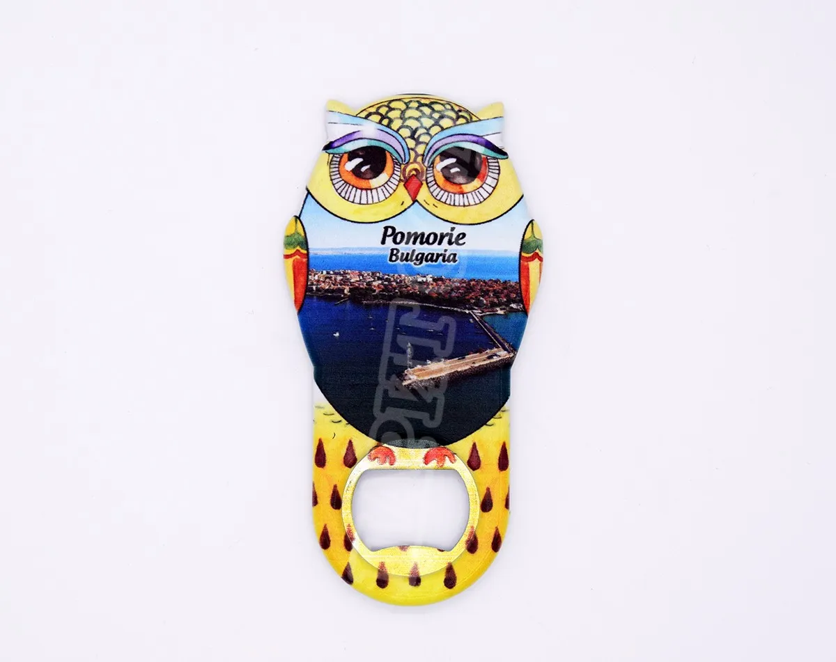 Сувенирна магнитна отварачка “сова“ със снимка от Поморие. Предлага се опакована в щендерен целофан.