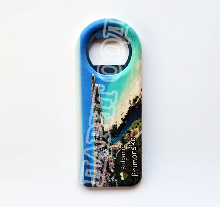 Сувенирна магнитна отварачка със снимка от Приморско и надпис Приморско, България. Предлага се опакована в щендерен целофан.