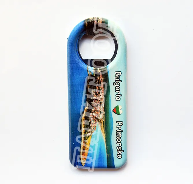 Сувенирна магнитна отварачка със снимка от Приморско и надпис Приморско, България. Предлага се опакована в щендерен целофан.