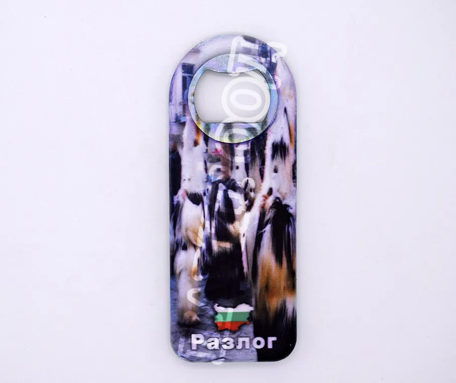 Сувенирна магнитна отварачка със снимка Разлог. Предлага се опакована в щендерен целофан.