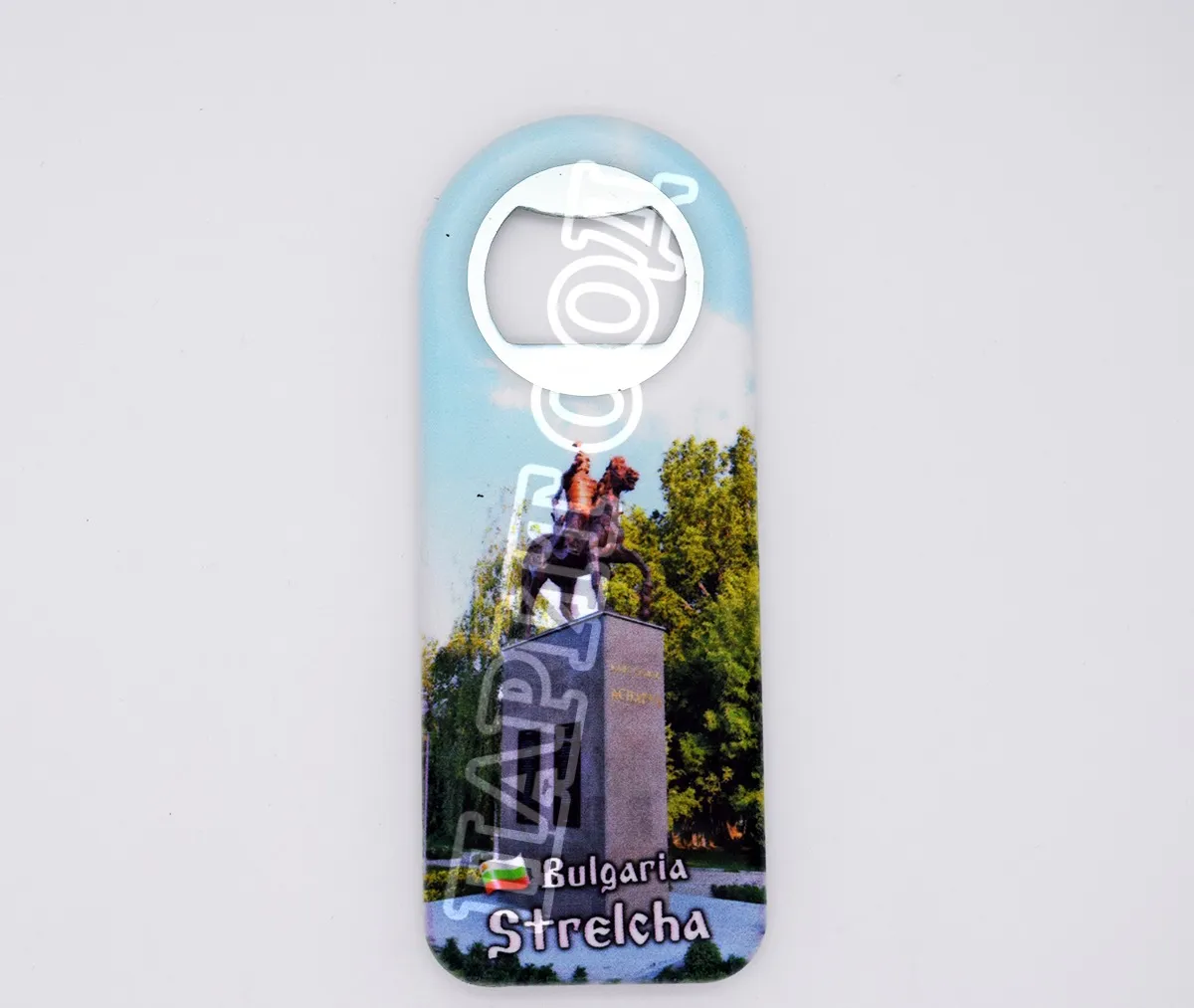 Сувенирна магнитна отварачка със снимка от Стрелча. Предлага се опакована в щендерен целофан.