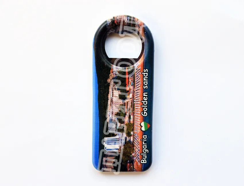 Сувенирна магнитна отварачка със снимка от к.к. Златни пясъци и надпис Златни пясъци, България. Предлага се опакована в щендерен целофан.