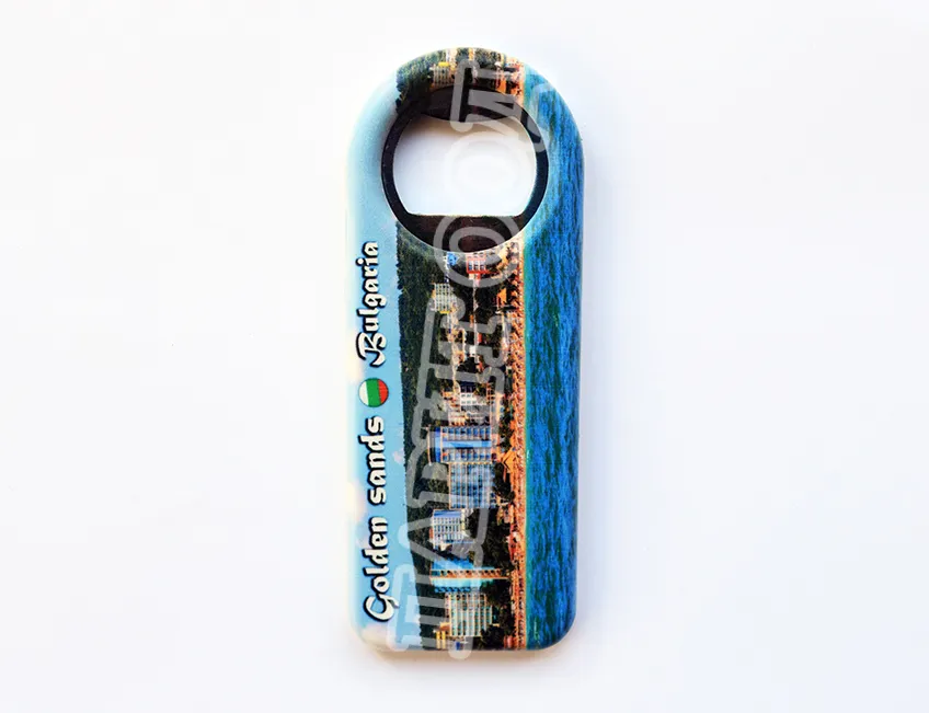 Сувенирна магнитна отварачка със снимка от к.к. Златни пясъци и надпис Златни пясъци, България. Предлага се опакована в щендерен целофан.