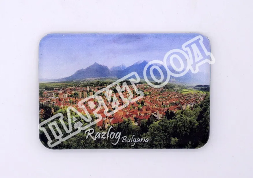 Сувенирна магнитна плочка със снимка от Разлог. Предлага се опакована в щендерен целофан.