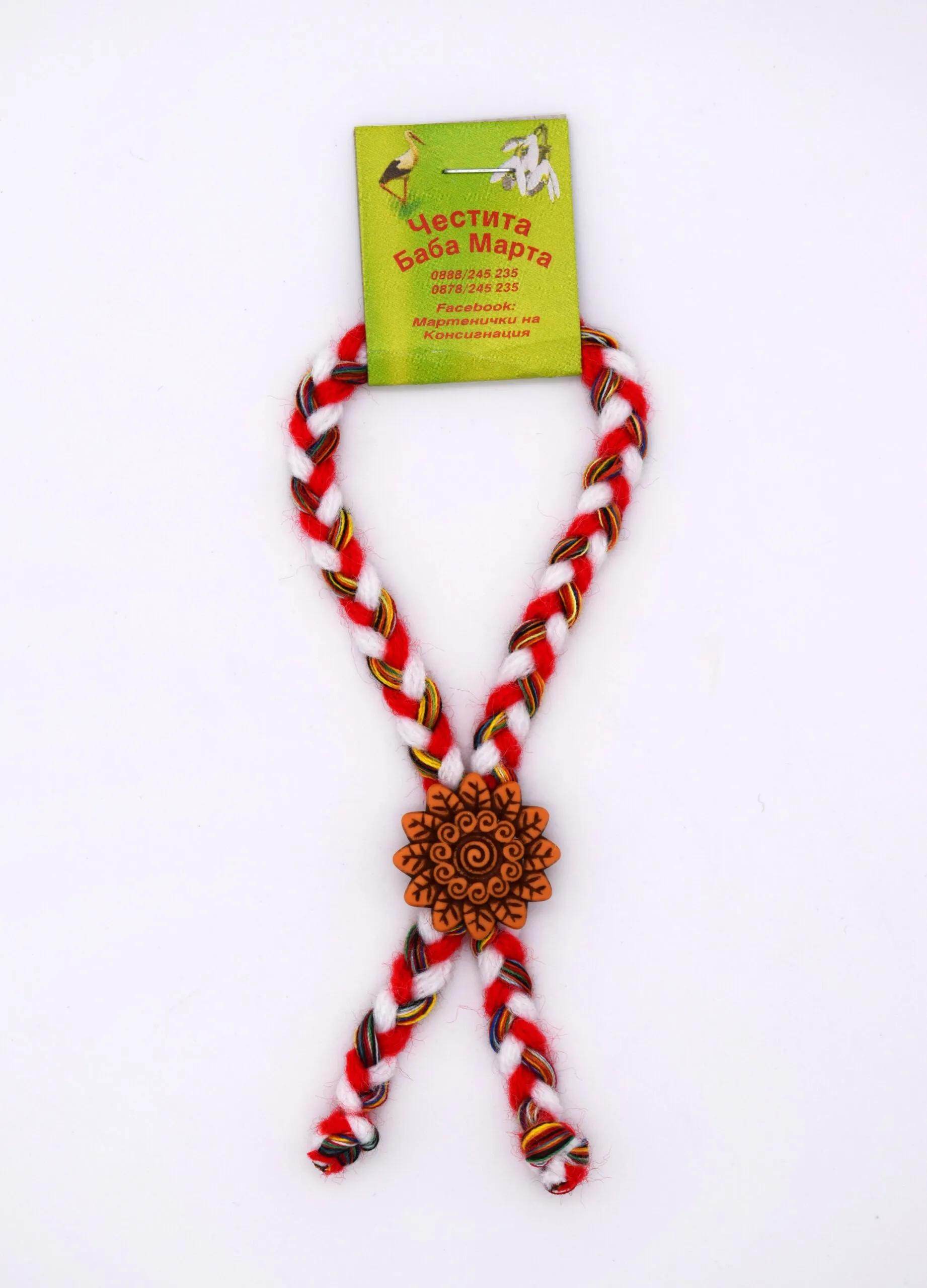 Материали: прежда, многоцветни конци, пластмасово мънисто