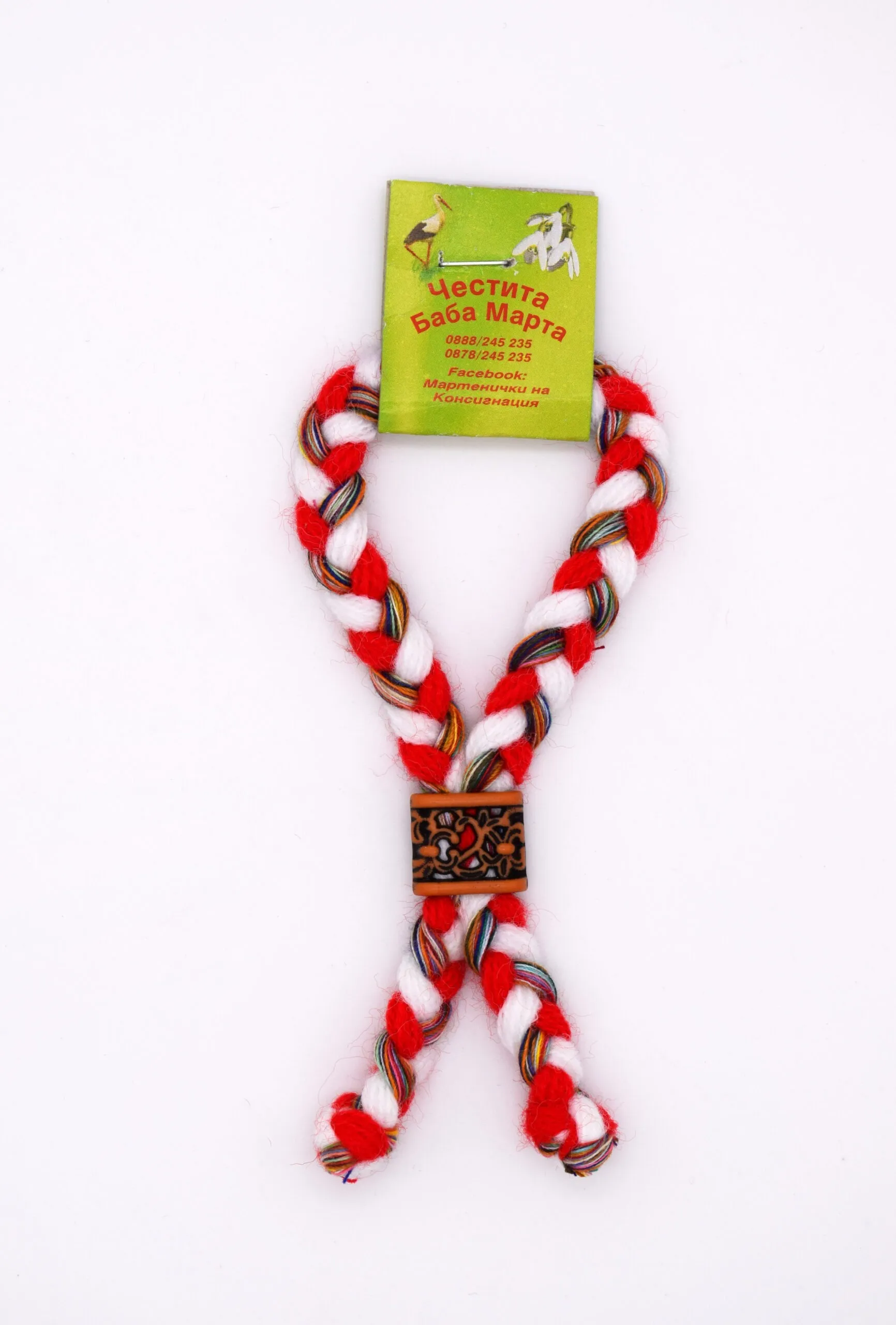 Материали: прежда, многоцветни конци, пластмасово мънисто