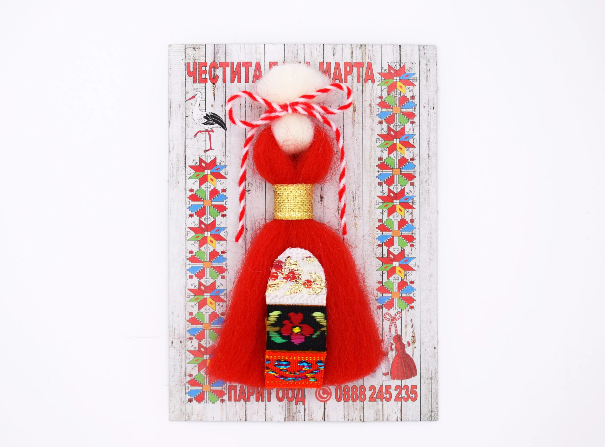 Мартеница за закичване във форма на пискюл с престилка.