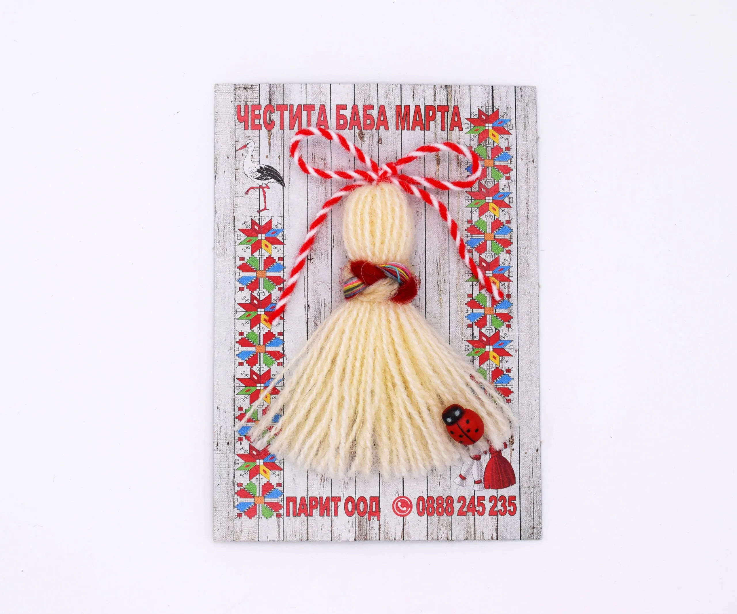 Мартеница за закичване във форма на пискюл и дървено мънисто.