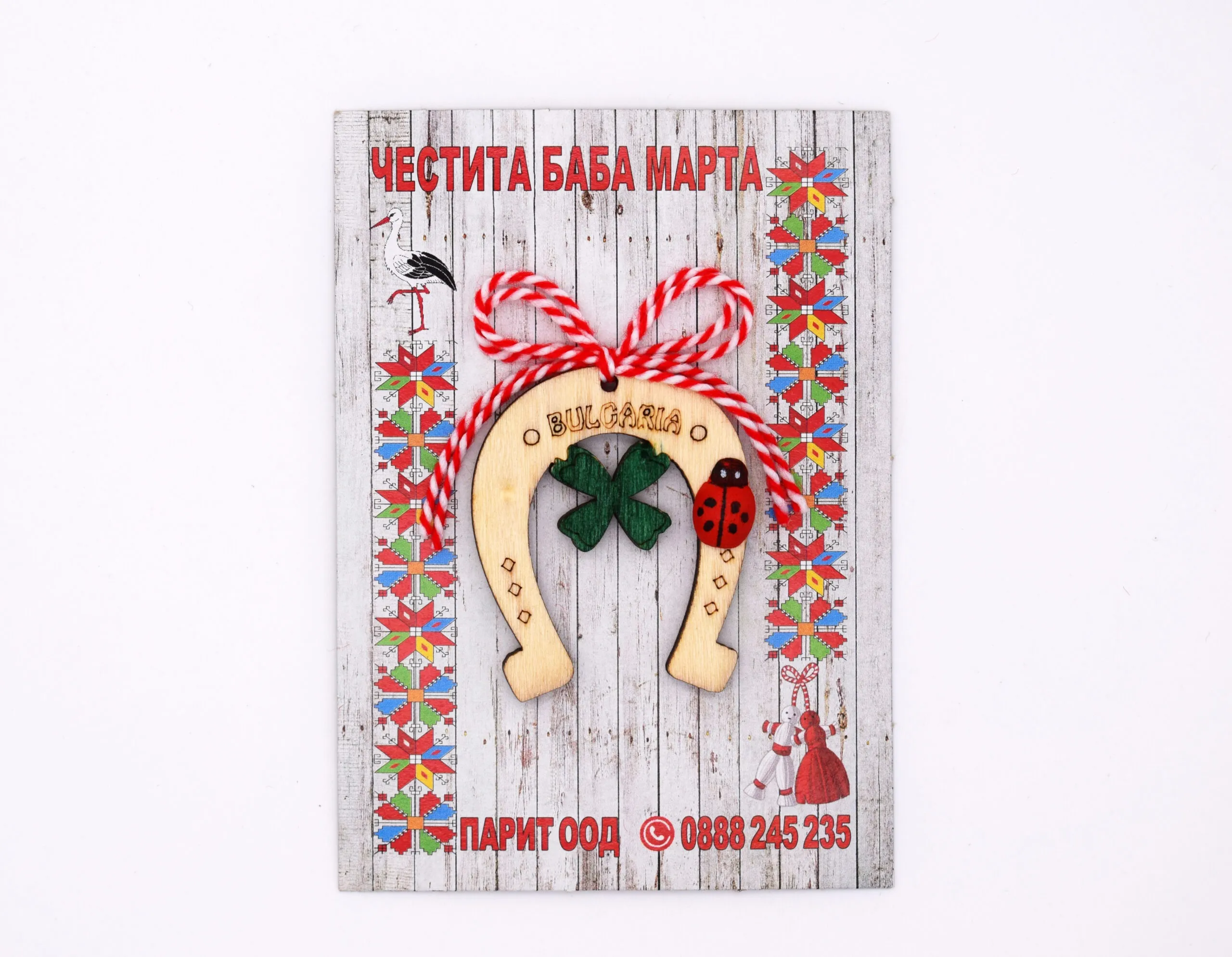 Мартеница във форма на подкова с панделка от пресукана прежда.