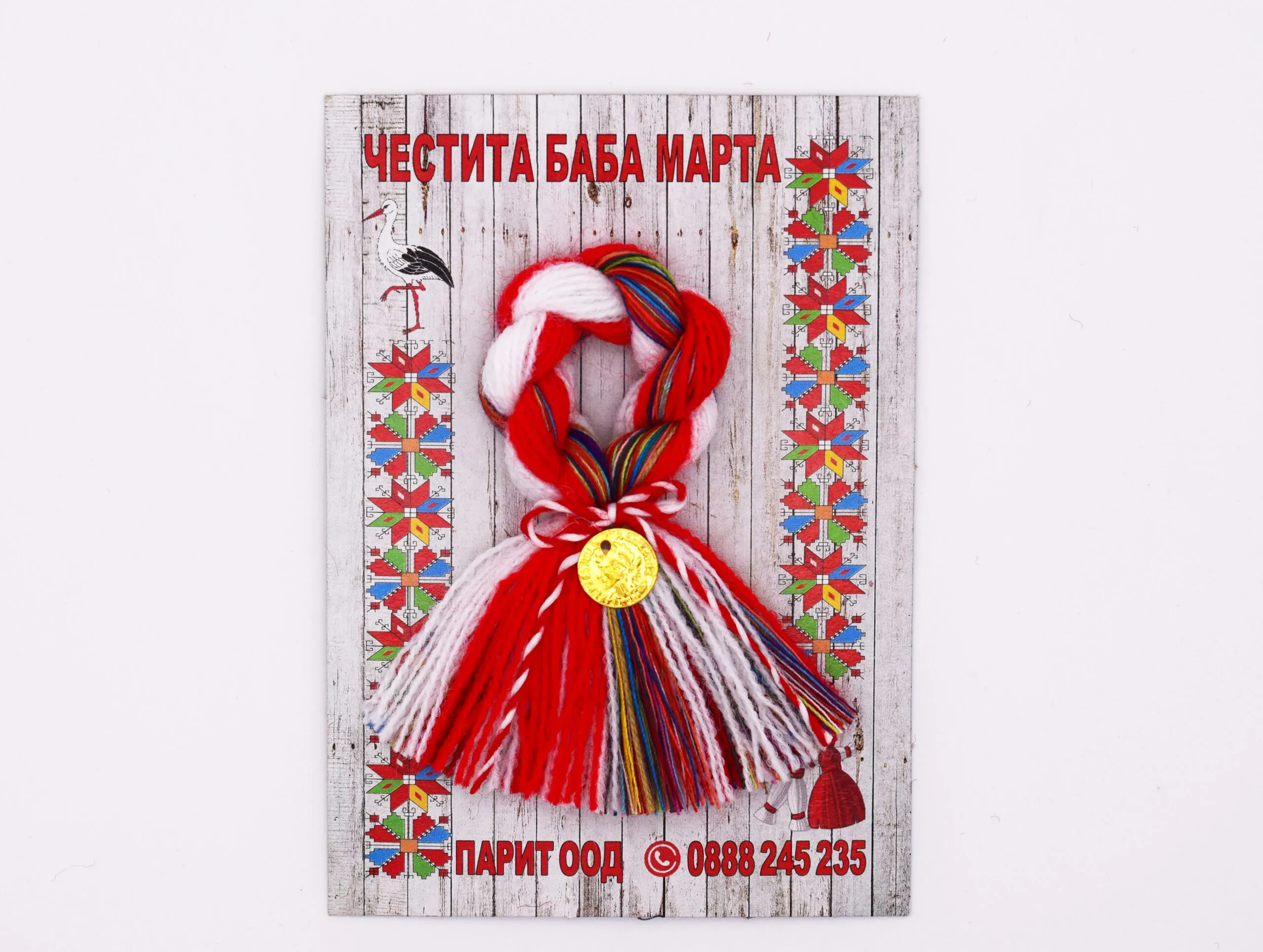 Мартеница за закичване във форма на венец с пискюл и паричка.