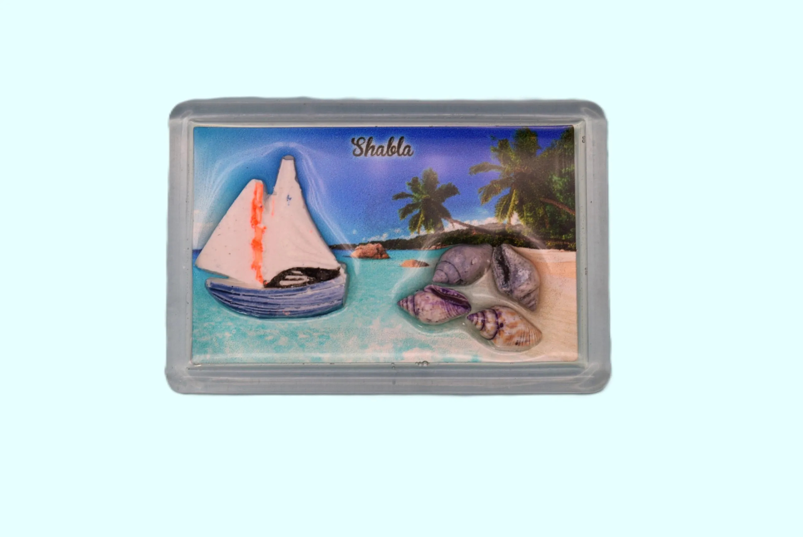 Ръчно изработен релефен магнит във формата на правоъгълна плочка, инкрустиран със стилни мъниста, истински мидени черупки, декоративни фигурки и тематична снимка, запечатани с прозрачен слой епоксидна смола.