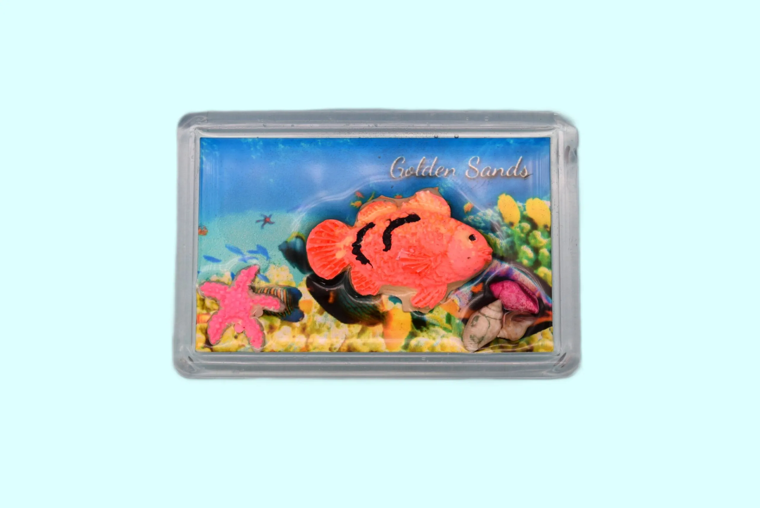 Ръчно изработен релефен магнит във формата на правоъгълна плочка, инкрустиран със стилни мъниста, истински мидени черупки, декоративни фигурки и тематична снимка, запечатани с прозрачен слой епоксидна смола.