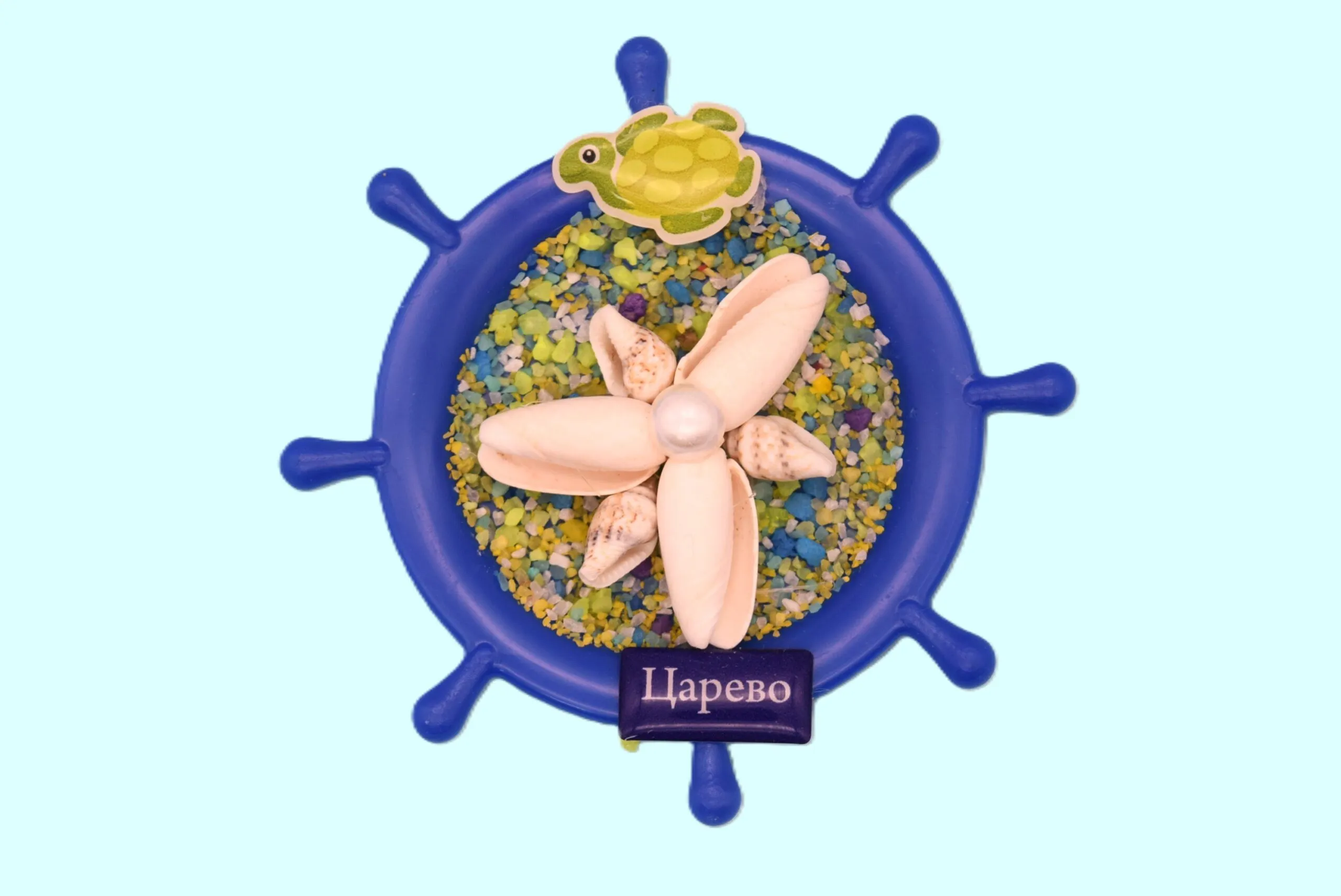 Ръчно изработен релефен 3D магнит тип корабен рул, инкрустиран с истински мидени черупки, стилни мъниста, декоративни фигурки и цветен пясък.