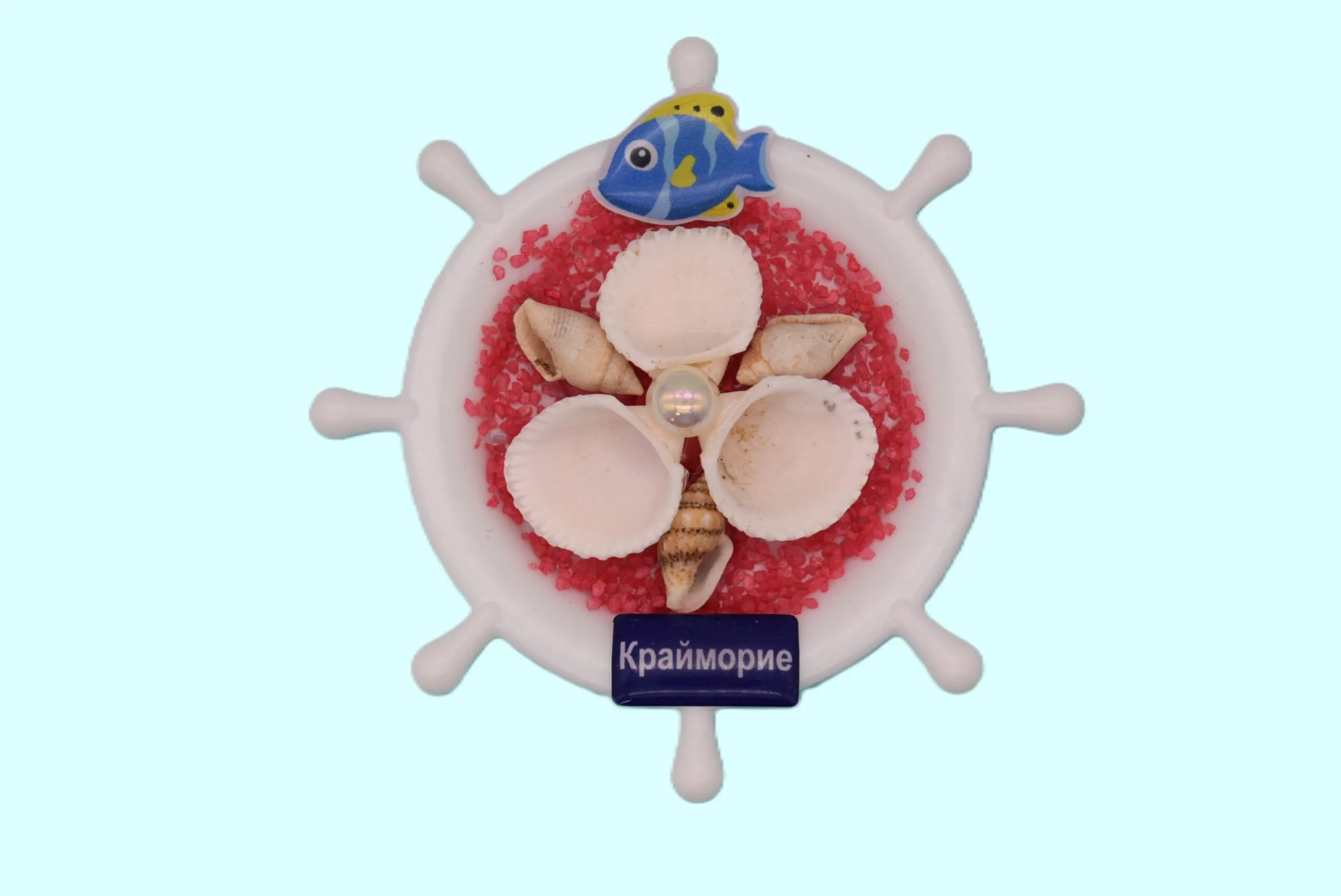 Ръчно изработен релефен 3D магнит тип корабен рул, инкрустиран с истински мидени черупки, стилни мъниста, декоративни фигурки и цветен пясък.